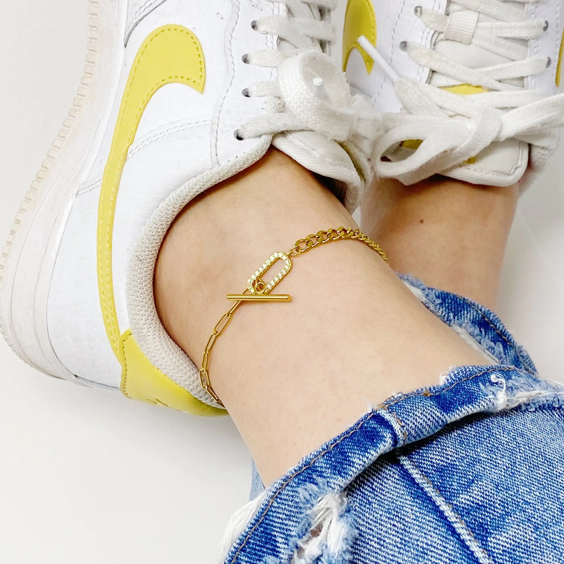 Esta tobillera de cadena mixta con cierre de palanca presenta dos cadenas diferentes magistralmente combinadas en un diseño precioso. El cierre de palanca con su hermosa circonita cúbica añade un brillo lujoso y un toque atrevido.