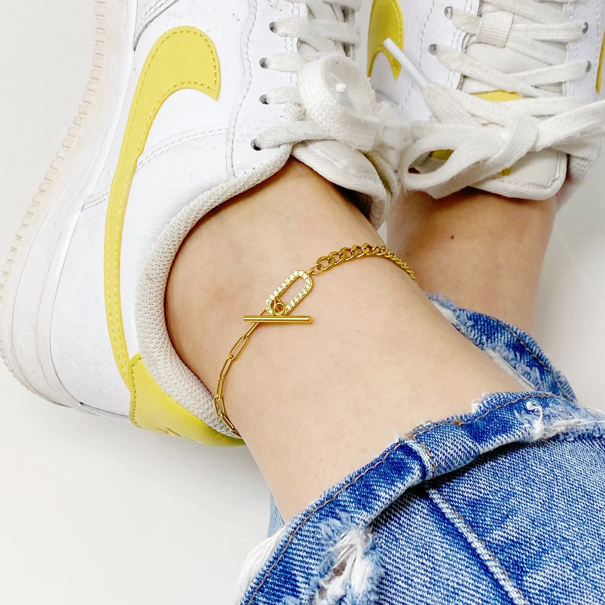 This Mixed Chain Glam Toggle Anklet features two different chains expertly blended in a gorgeous design. The toggle closure with its beautiful cubic zirconia adds luxurious sparkle and a hint of edginess.